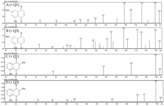 Mass spectra (LC–ESI–MS-MS) of 7-methyl juglone and plumbagin: (A) positive ESI-quadrupole (Q1) mass spectra of 7-methyl juglone; (B) positive ESI-quadrupole (Q3) mass spectra of 7-methyl jugline; (C) positive ESI-quadrupole (Q1) mass spectra of plumbagin; (D) positive ESI-quadrupole (Q3) mass spectra of plumbagin.