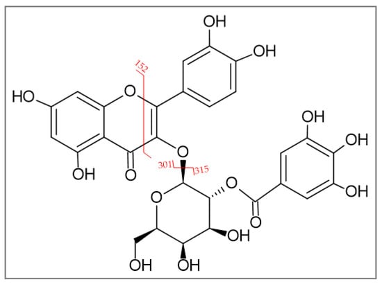 For the isolation of 2″-O-galloyl hyperoside, the 42% fraction of D. rotundifolia was used since significantly more 2″-O-galloyl hyperoside was present in D. rotundifolia than in D. intermedia. For this purpose, 2″-O-galloyl hyperoside was enriched from the EtOH extract of D. rotundifolia by solid phase extraction in the 42% fraction and then isolated from the fraction by size exclusion extraction. Mass scanning and MRM optimization of the 2″-O-galloyl hyperoside were performed for identification. The molecular peak m/z 617 in the positive scan and m/z 615 in the negative scan shown in Figure 3. The pseudomolecular ions m/z 151, 301, and 313 are characteristic of 2″-O-galloyl hyperoside and have been used for identification in other studies as well (see Table 2) [7,23]. Different cleavage sites of 2′′-O-galloyl hyperoside are shown in Figure 4.