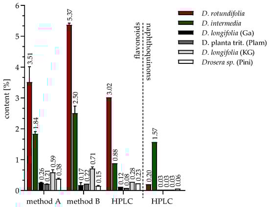 Flavonoid and naphthoquinone content of different Drosera species analyzed by three methods: HPLC (detected flavonoids: 2″-O-galloyl hyperoside, hyperoside, isoquercetin; quercetin and detected naphthoquinones: 7-methyl juglone, plumbagin) and two European Pharmacopoeia (Ph.Eur. 9.7, 01/2017:1174) content determination methods from the monographs, birch leaves (method A) and hawthorn leaves with flowers (method B); values indicate percentage of dry plant weight.