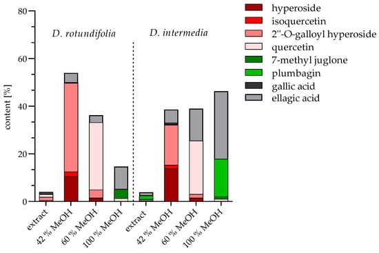 In order to obtain preliminary indications of which compounds investigated in this study are responsible for a biofilm inhibitory effect, fractions were obtained from the EtOH whole plant extracts by solid phase extraction chromatography and quantified by HPLC method. The composition of these fractions is shown in Figure 6. Compound groups in the extracts were separated into different fractions according to their polarity with increasing MeOH concentration. Three fractions were prepared from D. rotundifolia and D. intermedia, quantified by HPLC, and the values indicate percentage of dry fraction weight. The 42% MeOH fraction contains mainly 2″-O-galloyl hyperoside (37.27% for D. rotundifolia; 16.85% for D. intermedia), besides hyperoside (10.53% for D. rotundifolia; 13.88% for D. intermedia), ellagic acid (3.96% for D. rotundifolia; 5.61% for D. intermedia), isoquercetin (1.93% for D. rotundifolia; 1.42% for D. intermedia), and gallic acid (0.25% for D. rotundifolia; 0.96% for D. intermedia). The composition of 60% MeOH fraction mainly includes quercetin (28.25% for D. rotundifolia; 22.42% for D. intermedia) and hyperoside (1.25% for D. rotundifolia; 1.40% for D. intermedia). The 60% MeOH fraction also contains a small amount of 2″-O-galloyl hyperoside (3.44% for D. rotundifolia; 1.46% for D. intermedia). In addition, the 60% MeOH fraction of D. intermedia include a high proportion of ellagic acid (13.52%), in contrast to the 60% MeOH fraction of D. rotundifolia (3.01%). The 100% MeOH fraction consists mainly of ellagic acid (9.40% for D. rotundifolia; 28.42% for D. intermedia) and naphthoquinones, plumbagin in D. intermedia (15.86%) and 7-methyl juglone in D. rotundifolia (3.89%). Furthermore, quercetin (1.28%) is also present in 100% MeOH fraction for D. rotundifolia. Fractionation allowed the rough subdivision into a flavonoid glycoside fraction (42% MeOH fraction); a quercetin fraction (fraction 60% MeOH), which also contains plumbagin in D. intermedia; and a naphthoquinone fraction (100% MeOH fraction) with additional quercetin in D. rotundifolia. In the further aspects of the work, it was investigated whether the biofilm-inhibiting effect differs within the fractions, and thus provides indications of efficacy-determining ingredients.