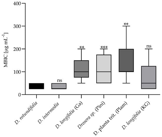 Minimum biofilm inhibitory concentration (MBIC) of six sundew samples against three multi-drug-resistant E. coli strains (PBIO729, PBIO730, PBIO1986). To evaluate whether the commercial sundew biomasses and D. intermedia had the same biofilm inhibitory efficacy as the species D. rotundifolia, the MBICs of the samples D. intermedia, D. longifolia (GA), Drosera sp. (Pini), D. planta trit. (Plam) and D. longifolia (KG) were compared with the sample D. rotundifolia; a significant difference in MBIC to D. rotundifolia indicates a reduced efficacy [n = 3/E.coli sp.]; data were analyzed by Kruskal–Wallis test; ns: p ≥ 0.05, **: p ≤ 0.0021, ***: p ≤ 0.0002.