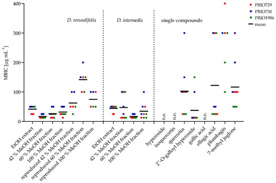 Minimum biofilm inhibitory concentration (MBIC) of D. rotundifolia (EtOH extract, MeOH fractions, reproduced MeOH fractions), D. intermedia (EtOH extract, MeOH fractions) and pure compounds (hyperoside, isoquercetin, 2″-O-galloyl hyperoside, gallic acid, ellagic acid, plumbagin, 7-methyl juglone) against three E. coli strains (PBIO729, PBIO730, PBIO1986).