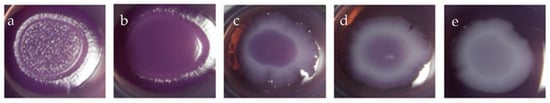 Different concentrations (400 µg mL−1, 300 µg mL−1, 200 µg mL−1, 100 µg mL−1, 150 µg mL−1, 50 µg mL−1, 25 µg mL−1, 12.5 µg mL−1) of the extracts and pure compounds were pipetted into a 24-well plate, the solvent was evaporated at room temperature, and 1 mL of liquefied Congo red agar (color solution: 50 mg Congo red, 25 mg Coomassie brilliant blue R250, 17.5 mL EtOH, 2.5 mL Aq. Bidest.; 2% of the color solution added to the agar: 10 g Bacto Tryptone, 5 g Bacto Yeast Extract, 18 g span agar, 1 L water) was pipetted into each well. After the agar had cooled down, 5 µL of a bacterial suspension with an OD of 0.5 was placed on the agar. After the bacterial suspension was dried on the plate, the plate was sealed with Parafilm®, incubated for 48 h at 28 °C. The production of curli fibers and cellulose was examined visually, a decolorization of the surface of the macrocolony signaled an inhibition of the matrix component studied (see Figure 9). The assay was performed in triplicate. For a detailed description of the assay, see Stepanov et al. [44].