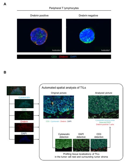 The TILs were quantified as previously described [,]. Briefly, the high-speed scanning of all the cytokeratin-positive areas was performed on the whole slides with BZ-X 700 using a 20× objective lens. Images of the full cytokeratin-positive areas were analyzed using StrataQuest (TissueGnotics, Vienna, Austria). The size and staining intensity of the DAPI and pan-cytokeratin were adjusted for nuclear and tumor detection. The cutoff thresholds for CD3 and drebrin were determined by two independent observers. Finally, all the images were automatically analyzed by StrataQuest, generating statistics including the numbers of CD3+ cells and CD3+/drebrin+ cells. The localization of the TILs was classified as being within the tumor cell nest or the surrounding stroma according to their relationships with the tumor cells. Cells localized inside the area of the pan-cytokeratin-positive tumor cells were recognized as TILs within the tumor cell nest; otherwise, the cells were recognized as TILs within the surrounding stroma. At the time of the quantitative analysis, the clinical information was blinded.