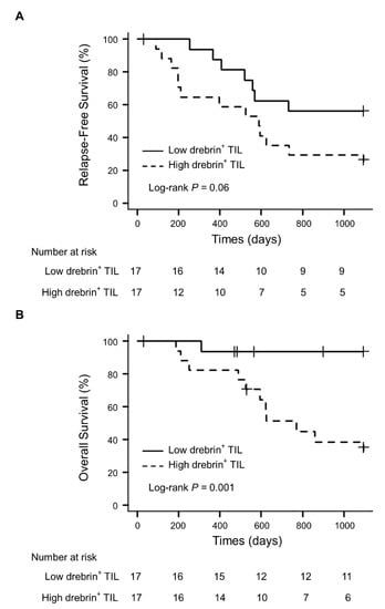 Association of drebrin-expressing TILs in tumor cell nests and survival outcomes. (A) Relapse-free survival of patients with high and low infiltrations of drebrin+ TILs. (B) Overall survival of patients with high and low infiltrations of drebrin+ TILs. TILs, tumor-infiltrating lymphocytes.