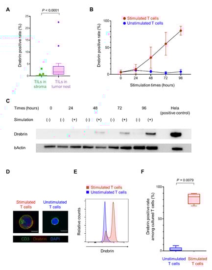 To elucidate the link between high drebrin+ T cell infiltration and poor clinical outcomes, we next characterized the drebrin+ T cells. NSCLC patients with abundant exhausted TILs have a short disease-free survival after surgical resection []. Therefore, we hypothesized that drebrin expression in the T cells may be involved in T cell exhaustion. Notably, the drebrin-expressing TILs in the tumor cell nest were significantly higher than those in the surrounding stroma (Figure 4A), suggesting that the stimulation of tumor antigens through direct contact between the tumor and T cells might have influenced the drebrin expression in TIME. First, we investigated the changes in drebrin expression in the peripheral T cells after their long-term stimulation in vitro. The purified CD3+ T cells from healthy donors were incubated with CD3/CD28/CD2 beads to stimulate the T cells and were cultured for a long period of time. The drebrin expression in the purified CD3+ T cells increased upon in vitro stimulation according to the culture period (Figure 4B,C). The number of drebrin-expressing CD3+ T cells was significantly higher under in vitro stimulation than unstimulated conditions (Figure 4D–F), indicating that T cell activation can induce drebrin expression in CD3+ T cells.