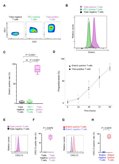 Chemokine ligand 13 (CXCL13) is significantly upregulated in highly exhausted TILs [,,,]. Therefore, we investigated the CXCL13 expression in the T cells. The number of CXCL13+ T cells was significantly higher in the triple-positive T cells than in the triple-negative T cells (Figure 5E,F). Additionally, the drebrin+ T cells expressed significantly higher levels of CXCL13 than the drebrin− T cells (Figure 5G,H).