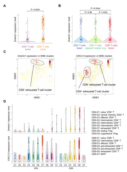 We analyzed single-cell data from a published database on the T cells of NSCLC patients []. The drebrin1 expression in isolated T cells from the peripheral blood, adjacent normal tissue, and tumors was investigated at the single-cell level. The drebrin1 expression in T cells from the peripheral blood was mainly observed in the CD8+ T cells (Supplementary Figure S1). In addition, drebrin1 was more abundant in the tumor-infiltrating CD8+ T cells than in the CD8+ T cells in the peripheral blood and adjacent normal tissues (Figure 6A,B). Drebrin1-expressing cells were most prominently represented in the exhausted tumor-infiltrating CD8+ T cell clusters at the single-cell level (Figure 6C,D), although CXCL13 was expressed in the exhausted tumor-infiltrating CD4+ and CD8+ T cell clusters (Figure 6C,D). PD-1 (PDCD1), TIM-3 (HAVCR2), and LAG-3 (LAG3) were broadly expressed in all the T cell clusters (Supplementary Figure S2). We analyzed another published database on NSCLC patients [], confirming that drebrin1 expression was observed in TILs, with a strong expression of exhaustion-associated molecules, including PD-1, TIM-3, LAG-3, and CXCL13.