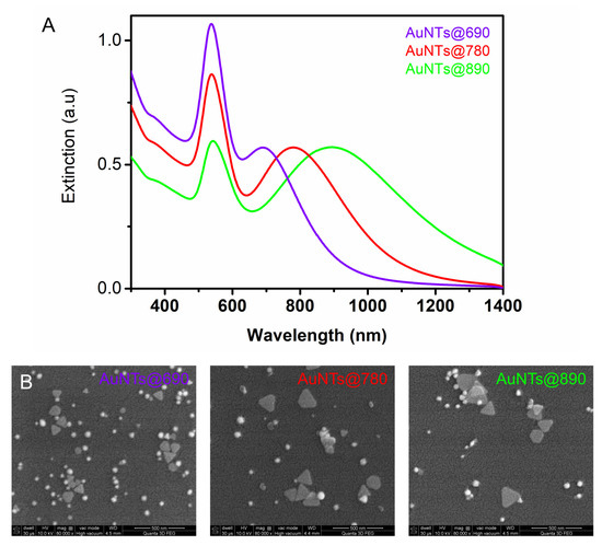 The synthesized colloidal solutions were first investigated using a UV-Vis-NIR spectrophotometer. The recorded extinction spectra in Figure 1A show the LSPR response of AuNTs that exhibit two well-defined bands. The first band is assigned to the out-of-plane dipole resonance of triangular AuNPs, while the second band corresponds to the in-plane dipole resonance. Considering the “bio” character of our synthesis method that employs gelatin as the only reducing and stabilizing agent, it is difficult to obtain a pure colloidal AuNTs solution uncontaminated by nanospheres. Therefore, as seen in the SEM images presented in Figure 1B, apart from AuNTs, spherical byproducts are obtained in all three samples. The plasmon resonance band of co-synthesized AuNSs overlaps with the out-of-plane dipole resonance of AuNTs centered at 534 nm. As we demonstrated in our previous work [24], the in-plane band of AuNTs evolves in time as a function of gelatin concentration. Herein, we selected an appropriate gelatin concentration, that allows the formation of differently-sized AuNTs with the in-plane resonance bands centered at 690, 780, and 890 nm. These AuNTs with specific LSPR bands in the NIR region were selected to be in-resonance and out-of-resonance with the 785 nm laser line, in view of their future investigation as photothermal agents. It is well known that for photothermal therapeutic applications, the NIR region has great potential and is highly desired due to the optical transparency of tissues in this “biological window”, where light can deeply penetrate into the tissue. It must be noted that AuNSs do not significantly influence the results obtained from AuNTs, as we will show later, therefore, in the next studies, we will refer only to the AuNTs.