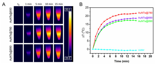 A AuNSs@534 sample was also investigated as a control to assess the contribution of the co-synthesized gold nanospheres from the colloidal AuNTs solutions. Figure S1 in Supplementary Materials proves that AuNSs do not significantly increase the temperature under 785 nm laser irradiation, since they have the LSPR band far from the laser resonance condition. As it can be seen, after 15 min irradiation, they present only a 3.87 °C temperature increase (Figure S1).