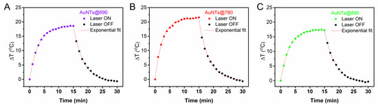 Figure 3. The thermal curves of the AuNTs with LSPR at (A) 690, (B) 780, and (C) 890 nm, respectively.