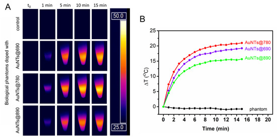 Figure 4. (A) The thermographic images of AuNTs doped biological phantoms during the irradiation with a 785 nm laser for 15 min and (B) the extracted corresponding thermal curves.