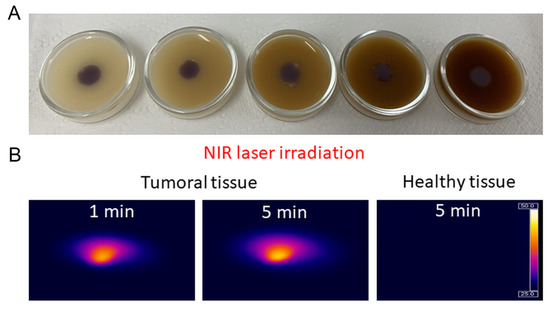 Next, the AuNTs photothermal performances were investigated in biological phantoms in order to assess their photothermal activity in simulated tissue for further implementation in in vitro PTT applications. These phantoms are tissue-mimicking models designed to simulate specific properties of the human body, such as light propagation and scattering, or electrical conductivity. The biological phantoms investigated in this study are based on agarose. They are semi-solid hydrogel structures made from agarose, water, and intralipid as a scatterer, that mimic the human skin [33]. In the case of photothermal agents, biological phantoms are essential as an intermediate stage for medical application to allow the evaluation of AuNPs effects on simulated tissue. This evaluation gives the possibility of AuNPs dose, laser intensity, and irradiation time adjustment to optimal values capable to induce the local temperature increase and subsequent apoptosis of cancer cells under irradiation.