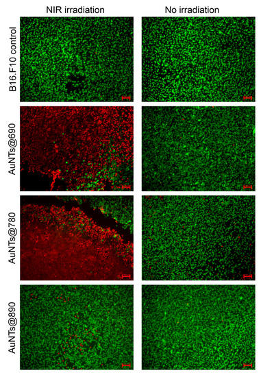 Further, we were interested to evaluate and compare the phototherapeutic effect of each AuNTs in vitro under NIR laser irradiation. In this context, we used a B16.F10 murine melanoma model. Specifically, the cells were first incubated with different AuNTs under the same conditions for 24 h. After treatment, the cells were washed with PBS to remove the uninternalized AuNPs and irradiated for 15 min with a 785 nm laser line using a power of 196 mW and a laser spot of about 1.5 mm. To assess the in vitro PTT effect on the cells, two different experiments were performed: fluorescence imaging and MTT assay.