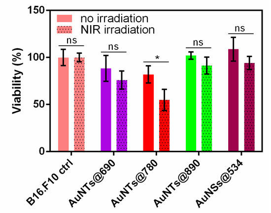 Figure 8. Cell viability of B16.F10 cells treated with different AuNPs before and after NIR irradiation. Two-way ANOVA analysis with Bonferroni posttest (ns, not significant, p > 0.05; * p < 0.05).