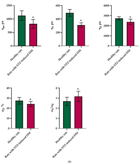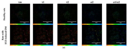 An analysis of the FLIM data showed that the islets cells of rats with STZ-induced DM differed from those of healthy rats in all tested parameters (p ≤ 0.05). Namely, the islets cells of rats with STZ-induced DM were characterized by lower values of τm, τ1, τ2, and α2 and higher values of the fluorescence lifetime contributions ratio (α1/α2) compared to the islets cells of healthy rats (Figure 1). Despite the fact that each of the parameters of islet cells of rats with STZ-induced DM is statistically significantly different from cells without pathology, several parameters can be distinguished, for which the differences between them is particularly pronounced. These are the parameters τm and τ1. Moreover, based on the values of α2 and α1/α2, we can assume that glycolysis predominates in the islets cells of rats with STZ-induced DM, while the islets cells of rats without pathology rely predominantly on OXPHOS.