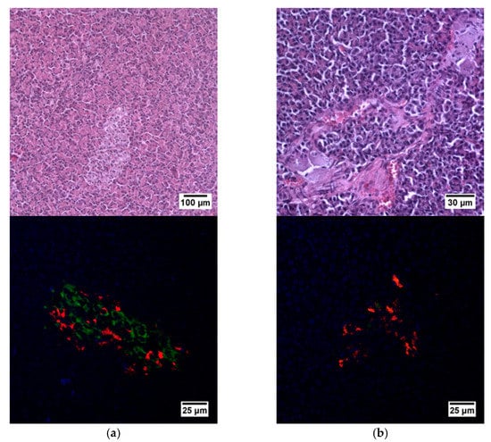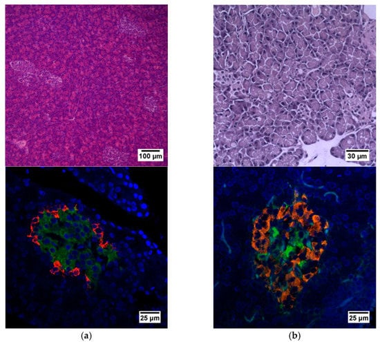 Histological (upper row) and immunohistochemical (lower row) analysis of the pig pancreas. (a) An islet of Langerhans of a healthy pig, and (b) an islet of Langerhans of a pig with STZ-induced DM. Staining with hematoxylin and eosin. Staining with antibodies to glucagon (red) and to insulin (green) and nuclei (blue).
