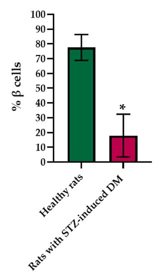 Analysis of the percentage of beta cells in the pancreas islets of healthy rats and of rats with STZ-induced DM. *—p = 0.00000.