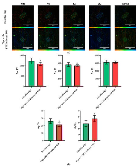 FLIM of NAD(P)H in pancreatic islets of healthy pigs and of pigs with STZ-induced DM. (a) Pseudo-color-coded images of τm, τ1, τ2, α2 and α1/α2 of the NAD(P)H in pancreatic islets of healthy pigs and in pigs with STZ-induced DM (scale bars: 600–1100 ps (τm), 200–500 ps (τ1), 1500–3000 ps (τ2), 10–25% (α2) and 1–6 (α1/α2)). The scale length in all pictures is 100 µm. (b) Mean values of τm, τ1, τ2, α2, α1/α2 of the NAD(P)H in pancreatic islets of healthy pigs and in pigs with STZ-induced DM (mean ± SD). *—p = 0.00000.