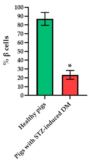 Analysis of the percentage of beta cells in the islets of the pancreas of healthy pig compared with a pig with STZ-induced DM. *—p = 0.00000.