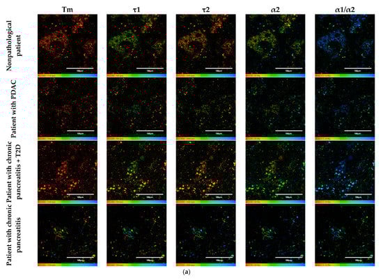 FLIM of NAD(P)H in human islets of nonpathological patient and islets with pathologies (PDAC, chronic pancreatitis + T2D and chronic pancreatitis). (a) Pseudo-color-coded images of τm, τ1, τ2, α2 and α1/α2 of the NAD(P)H in human islets of nonpathological patient and islets with pathologies (scale bars: 600–1100 ps (τm), 200–500 ps (τ1), 1500–3000 ps (τ2), 10–25% (α2) and 1–6 (α1/α2)). The scale length in all pictures is 100 µm. (b) Mean values of τm, τ1, τ2, α2 and α1/α2 of the NAD(P)H in human islets of nonpathological patient and islets with pathologies (mean ± SD). *—p ≤ 0.05.