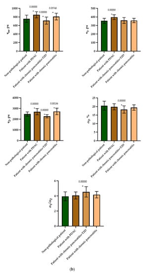 To do this, as in the case of the animal pancreas samples, the following parameters were analyzed: fluorescence lifetimes (τm, τ1, τ2) and the fluorescence lifetime contributions (α2 and α1/α2 ratio) of the free and bound forms of NAD(P)H. When comparing the parameters of the islet cells of nonpathological patients and of a patient with PDAC, a statistically significant difference was revealed in three parameters, namely, the fluorescence lifetimes (τm, τ1 and τ2), with the highest values being in the cells of the patient with pathology. No differences were found in the contribution of the bound form of NAD(P)H nor in the ratio of the contributions of the free and bound forms of the coenzyme, which may indicate that the two subjects have similar energy metabolism. When comparing the islet cell parameters of nonpathological patient and a patient with chronic pancreatitis + T2D, statistically significant differences were found in 4 FLIM parameters out of the 5 studied (τm, τ2, α1, α2 and α1/α2) (Figure 7). It is important to note that in the islet cells of the patient with chronic pancreatitis + T2D, the contribution of the bound form of NAD(P)H was lower than in the cells from the nonpathological patient, which may indicate the former’s more glycolytic phenotype. Additionally, the result is consistent with the data on laboratory animals: the islet cells of animals with STZ-induced DM also had a more glycolytic phenotype compared to cells of healthy animals. When comparing the parameters of the islet cells of nonpathological patient and a patient with chronic pancreatitis, a statistically significant difference was found in only two out of the five parameters, namely, the average fluorescence lifetime and the fluorescence lifetime of the bound form of NAD(P)H were both greater in the cells of the patient with this pathology.