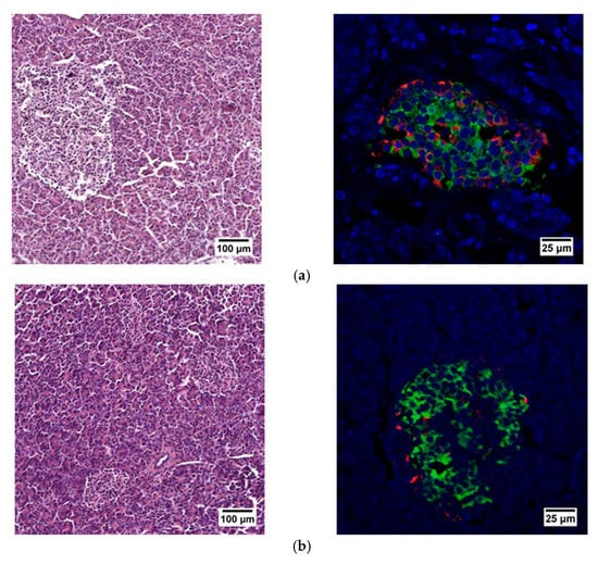 Native pancreas tissues were processed for histological and immunohistochemical analysis. Pieces of the pancreas were fixed in formalin and subsequently embedded in paraffin. Seven-micrometer slices of the pancreas were subjected to standard histological wiring and stained with hematoxylin-eosin to visualize the structure. Four-micrometer slices of the pancreas are susceptible to immunofluorescence staining. Immunofluorescence double staining was performed using a primary antibody of glucagon monoclonal (1:10; Invitrogen, Carlsbad, CA, USA) and insulin monoclonal antibody (1:100; Invitrogen, Carlsbad, CA, USA) overnight at 4 °C. The samples were counterstained with DAPI (1:1000; BioLegend, San Diego, CA, USA) according to the manufacturer’s protocol. The percentage of beta cells was calculated using the ImageJ 1.43u program (NIH, Bethesda, MD, USA), as the ratio of the area of beta cells to the area of the entire islets.