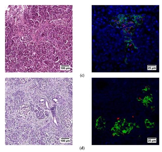 Histological (left) and immunohistochemical (right) analysis of the human pancreas. (a) nonpathological patient; (b) patient with PDAC; (c) patient with chronic pancreatitis + T2D and (d) patient with chronic pancreatitis.