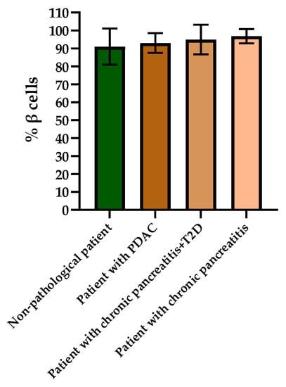 When evaluating the histological picture, we found that the pancreatic tissue of the nonpathological patient had a lobular structure with the inclusion of mature adipose tissue. The parenchyma was represented by acinar glands and by a typically compact secretory apparatus. The ducts had a typical appearance. In the patient with PDAC the tissue of the pancreas was also lobular in structure, the parenchyma was represented by typical acinar glands and characteristically compact secretory apparatus and ducts were present. The patient with chronic pancreatitis + T2D had pancreatic tissue of lobular structure but with unexpressed fibrosis of the perilobular and intralobular stroma, the secretory apparatus was preserved and represented by compact islets of Langerhans of typical appearance and with typical ducts. In the patient with pancreatitis, deformation of the lobular structures of the pancreatic parenchyma and pronounced fibrosis of the perilobular and intralobular stroma was observed, although the secretory apparatus was preserved and represented by compact islets of Langerhans of a typical type, with intralobular ducts also characterized as being typical. Using IHC analysis we showed that the patients with the different pancreas pathologies did not differ in the ratio of alpha and beta cells (Figure 8 and Figure 9). The obtained results are consistent with the FLIM data and indicate that the islets in patients with PDAC and chronic pancreatitis are similar to nonpathological islets and are characterized by a similar metabolic status. However, the islet cells of the patient with chronic pancreatitis + T2D, despite the absence of serious morphological changes, were characterized by a more glycolytic metabolism, which is apparently associated with the course of type 2 diabetes.