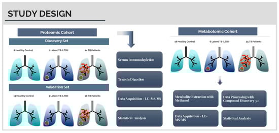 A combined approach of LC-MS-based proteomics and metabolomics was employed in this study to find a new signature of tuberculosis biomarkers in serum. For that, two different cohorts were used: one to assess new serum proteins that can be used as TB biomarkers (discovery set) and the other to validate the results obtained (validation set). For the metabolomic study, the two cohorts were merged. The cohorts were divided into three experimental groups: 1. Healthy individuals, with a negative IGRA test (control group); 2. Healthy, latently infected individuals who tested positive to the IGRA test (LTBI group); and 3. Patients diagnosed with pulmonary and extrapulmonary tuberculosis (TB group) (see Figure 1).