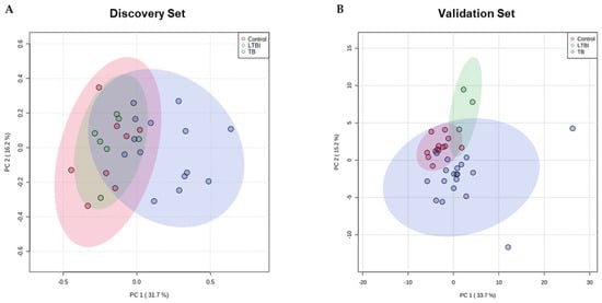 Serum proteomic PCA for the discovery and validation sets. PCA scores plot for the first and second components for the three experimental groups: control (red), LTBI (green), and TB (blue) for the discovery (A) and validation (B) sets. Areas in red, green, and blue represent the 95% confidence region. Dots within each area represent the replicates for each condition: n(control) = 8, n(LTBI) = 7, and n(TB) = 14 in the discovery set, and n(control) = 13, n(LTBI) = 3, and n(TB) = 18 in the validation set.