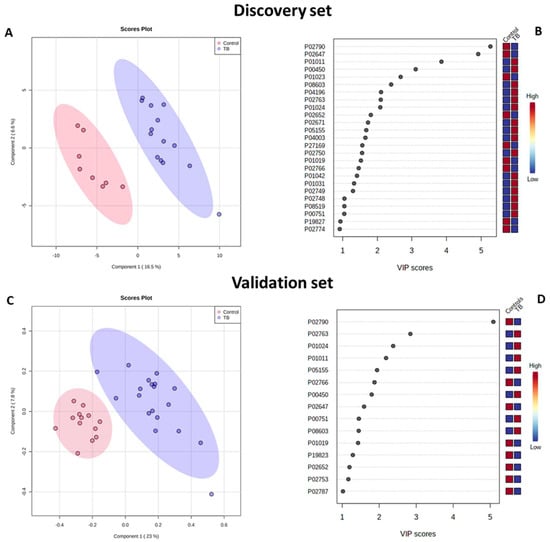 Serum proteomics PLS-DA model discriminates between controls and TB patients in the (A,B) discovery and (C,D) validation sets. (A,C) PLS-DA scores plot for the first and second components constructed with controls and TB patients serum proteins (for the discovery set: Q2 = 0.841, permutations (2000) p = 0.018, n(control) = 8 and n(TB) = 14; for the validation set: Q2 = 0.754, permutations (2000) p = 0.005, n(control) = 13 and n(TB = 18). Areas in red and blue represent the 95% confidence region. Dots represent the replicates for each condition. (B,D) Proteins responsible for the discrimination in the first component (VIP > 1.0).