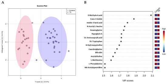 OPLS-DA model based on the metabolites quantified by LC-MS discriminates TB patients from the control group. (A) Score plot of the OPLS-DA model shows a clear discrimination between the serum metabolites levels of patient and control groups (Q2 = 0.733, permutations (2000) p < 0.001). Areas in red and blue represent the 95% confidence region. Dots represent the replicates for each condition (n(control) = 18 and n(TB) = 25). (B) The metabolites that are important for the discrimination between the two groups (VIP > 1.5 in the first component).