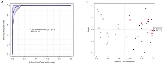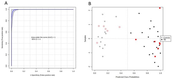 ROC analysis based on the metabolomic data. (A) The combination of five metabolites (9-methyluric acid, indole-3-lactic acid, trans-3-indoleacrylic acid, hexanoylglycine, and N-acetyl-L-leucine) present an AUC = 1 using a linear SVM model. (B) Sample distribution within the model; samples used for the model are in black and the hold-out samples are in red. Open and filled circles represent control and TB samples, respectively.