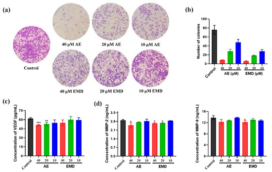 Vascular endothelial growth factor (VEGF) is an important factor in regulating angiogenesis. Inhibiting the production of VEGF to target tumor angiogenesis contributes to control tumor growth and metastasis. The results showed that AE could significantly inhibit the secretion of VEGF, while EMD had no significant inhibitory effect (Figure 5c). Moreover, we also measured the effects of AE and EMD on MMP-2 and MMP-9. Figure 5d showed that 40 μM AE could significantly inhibit the secretion of MMP-2. EMD had a good inhibitory effect on MMP-2 and MMP-9, while the inhibitory effect on MMP-2 was weaker than that of AE.