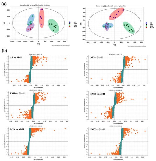 PCA score plots of aloe emodin (AE), emodin (EMD), doxorubicin (DOX), and control group (M + H) in positive (left) and negative (right) ion mode (a). S-polts of metabolic profiling between aloe emodin (AE)/emodin (EMD)/doxorubicin (DOX) and control group (M + H) in positive (left) and negative (right) ion modes. The orange and green cubes represent metabolites of VIP>1 and VIP<1, respectively (b).