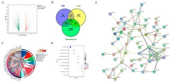 Discovery of differentially expressed genes and aberrant metabolic pathways in high-risk neuroblastoma. (A) Volcano plots of differentially expressed genes (DEGs) in the GSE49710 dataset. The x-axis represents fold change in gene expression and the y-axis represents FDR. The red and green dots in the graph represent statistically significant up- and down-regulated genes. (B) Venn diagrams of DEG, lipid-metabolism-related genes and genes screened by univariate CCox. (C) Gene ontology (GO) analysis of 58 genes. (D) Kyoto Encyclopedia of Genes and Genomes (KEGG) analysis of 58 genes. (E) Protein–protein interaction (PPI) network of 58 genes.