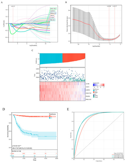 Difference analysis and survival analysis showed that these lipid-metabolism-related genes were significantly associated with NB risk (Figure A1A) and overall survival time (Figure A1B). Next, we performed LASSO Cox regression analysis to integrate survival time, survival status and gene expression data to obtain the optimal survival prediction model (Figure 2A–C). Finally, when the Lambda value is 0.120812060485213, the model formula constructed by six genes is obtained: