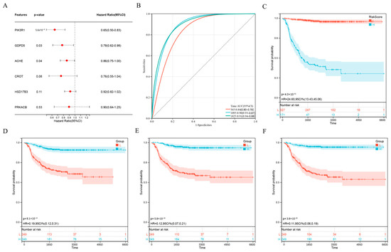 Interestingly, the ROC curve of the new scoring formula, composed of ACHE, GDPD5 and PIK3R1 (Figure 3B), was similar to the ROC curve composed of the previous six genes (Figure 2E) and better than the ROC curve of any single gene among them (Figure A2). In addition, the new scoring formula and ACHE, GDPD5 and PIK3R1 as independent prognostic factors can effectively distinguish populations with different prognosis (Figure 3C–F). This allows us to reduce the number of genes without affecting the AUC value, resulting in better clinical applicability.