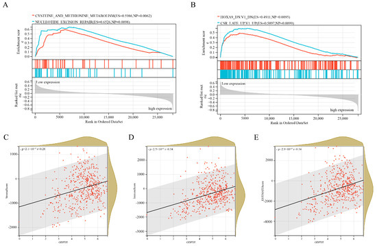 Gene Set Enrichment Analysis (GSEA) and immune infiltration analysis of GDPD5. (A) Two KEGG pathways enriched in samples with high GDPD5 expression. (B) Two KEGG oncology signatures enriched in samples with high GDPD5 expression. (C–E) The relationship between the expression of GDPD5 and stromal score (C), immune score (D) and estimate score (E). The horizontal axis represents the expression of GDPD5 and the vertical axis represents the score.