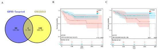 Identification of GDPD5-targeted miRNAs. (A) Venn diagram of differentially expressed miRNAs and GDPD5-targeted miRNAs. (B,C) Kaplan–Meier analysis of hsa-miR-592 (B) and hsa-miR-604 (C) in the GSE121513 dataset.