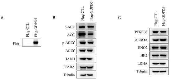 Immunoblot analysis. (A) Immunoblot analysis of transfected flag-GDPD5 or transfected flag-ctrl. (B) Western blot analysis of lipid-metabolism-related markers. (C) Western blot analysis of markers related to glucose metabolism. ACC (Acetyl-CoA Carboxylase Alpha), ACLY (ATP Citrate Lyase), HADH (Hydroxyacyl-CoA Dehydrogenase), Fructose-2,6-Biphosphatase 3 (PFKFB3), PPARA (Peroxisome Proliferator Activated Receptor Alpha), ALDOA (Aldolase, Fructose-Bisphosphate A), ENO2 (Enolase 2), HK2 (Hexokinase 2), LDHA (Lactate Dehydrogenase A).