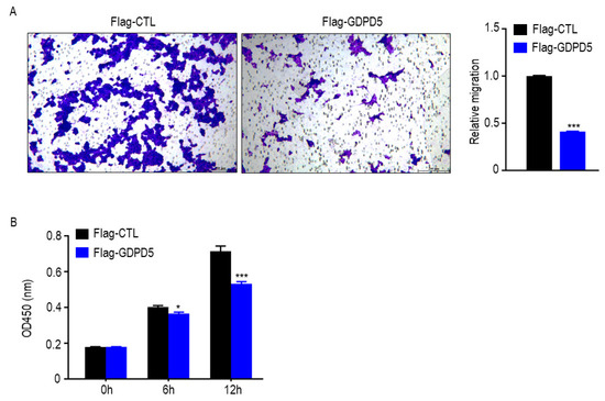 After cells were transfected for 48 h, the cell counting kit-8 (CCK-8) assay kits (MedChem Express, NJ, USA) were used for cell viability analyze. The Flag-CTL or Flag-GDPD5 cells were seeded in 96-well plates at a density of 2 × 104 cells per well and cultured for 0 h, 6 h and 12 h. Then the DMEM medium (100 μL) and CCK8 solution (10 μL) were added to each well and incubated for 1 h. Finally, the absorbance of each well was measured at 450 nm using a microplate reader (Thermo Scientific, Waltham, MA, USA). A two-tailed paired or unpaired t-test statistical analysis was performed using GraphPad Prism 8 software (GraphPad, San Diego, CA, USA).