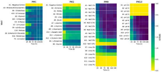 Heatmaps depicting the growth (OD590 values) of strain C2.2 in selected wells of Biolog plates PM1, PM3, PM9, and PM10. OD590 values determined at 24 h intervals.
