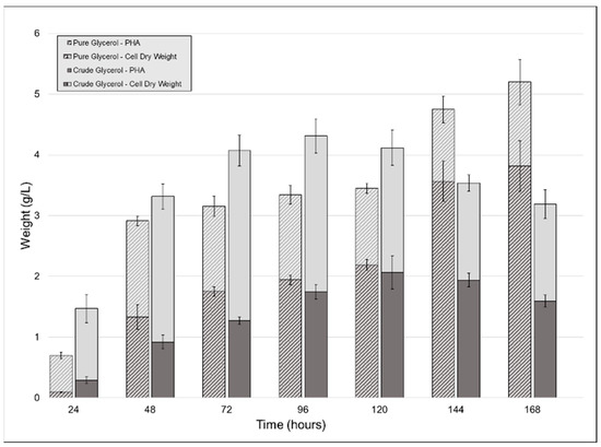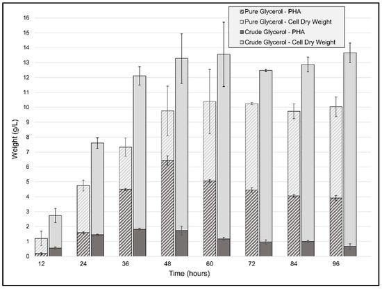 Cell dry weight (CDW) and polyhydroxyalkanoate biosynthesis profile of P. ganghwense in 2 L batch cultivations using 20 g/L pure glycerol and crude glycerol, respectively. Error bars represent the standard deviation of biological and technical replicates.