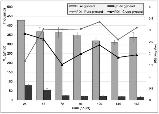 Molecular weight (Mw) and PDI (polydispersity index, the ratio of the average number molecular weight (Mn) to Mw) values for the PHA obtained from the cultivation of strain C2.2 using pure glycerol and crude glycerol as sole carbon sources, respectively, throughout a seven-day shake-flask cultivation. Error bars represent the standard deviation of biological and technical replicates.