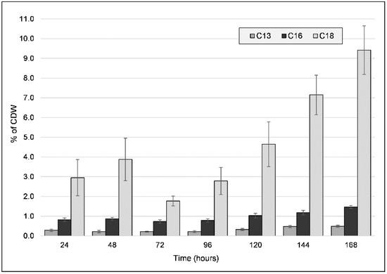 Fatty acid (C13, C16, C18 fatty acids) content (wt% of cell dry weight (CDW)) of freeze-dried biomass obtained from the cultivation of strain C2.2 using crude glycerol as a sole carbon source throughout a seven-day shake-flask cultivation. Error bars represent the standard deviation of biological and technical replicates.