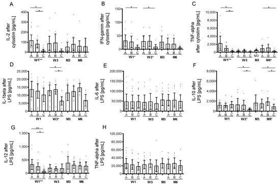 | IL-9 | 4.4 (6.2) | 4.4 (6.6) | 5.5 (6.5) | 6.2 (7.7) | 4.4 (5.7) | 5.0 (5.4) | 2.5 (3.0) | 2.8 (3.7) | 2.5 (2.9) | 2.8 (3.5) | 2.0 (1.4) | 3.6 (4.7) | 3.1 (4.3) | 3.1 (3.3) |