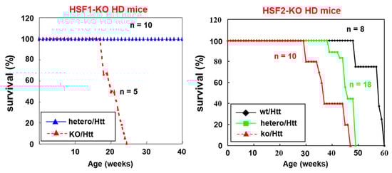 Deficiency of HSF1 and HSF2 causes the shortening of life span in Huntington’s disease (HD) mice. HSF1-KO HD mice died within 24 weeks but HSF1-hetero HD mice survive more than 40 weeks (left). HSF2-KO HD and HSF2-hetero HD mice died within 46 and 48 weeks (right), respectively. But HSF2-WT HD mice survived until 60 weeks.