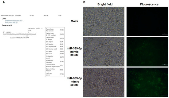 miR-369-3p targets Psmb9, binding a specific sequence in 3′UTR mRNA. (A) Sequence alignment of the miR-369-3p base pairing sites in 3′ UTR of Psmb9 mRNA. (B) Transfection efficiency of RAW 264.7 mouse macrophages. RAW 264.7 cells were transfected with FAM-labeled miR-369-3p mimic at concentrations of 30nM and 50nM. Representative images of RAW 264.7 transfected with FAM-labeled miR-369-3p mimic. Bright field (left) and fluorescence (right) images for the mock condition and transfected conditions were acquired by fluorescence microscopy. Original magnification, ×20. Scale bar presents 50 μm.